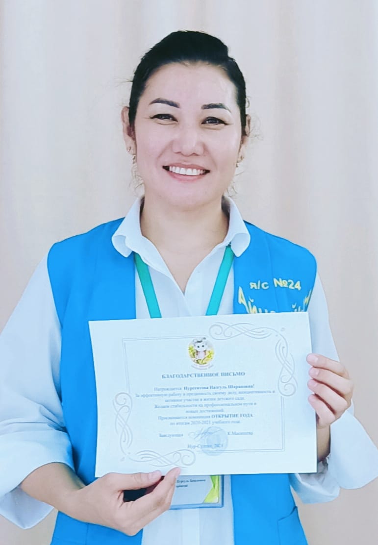 Лауазымы: Тәрбиеші Білімі: арнаулы орта Еңбек өтілі: 3 жыл Марапаттаулар: 2.Алғыс хат. Астана қаласы білім басқармасы.2023ж Толығырақ