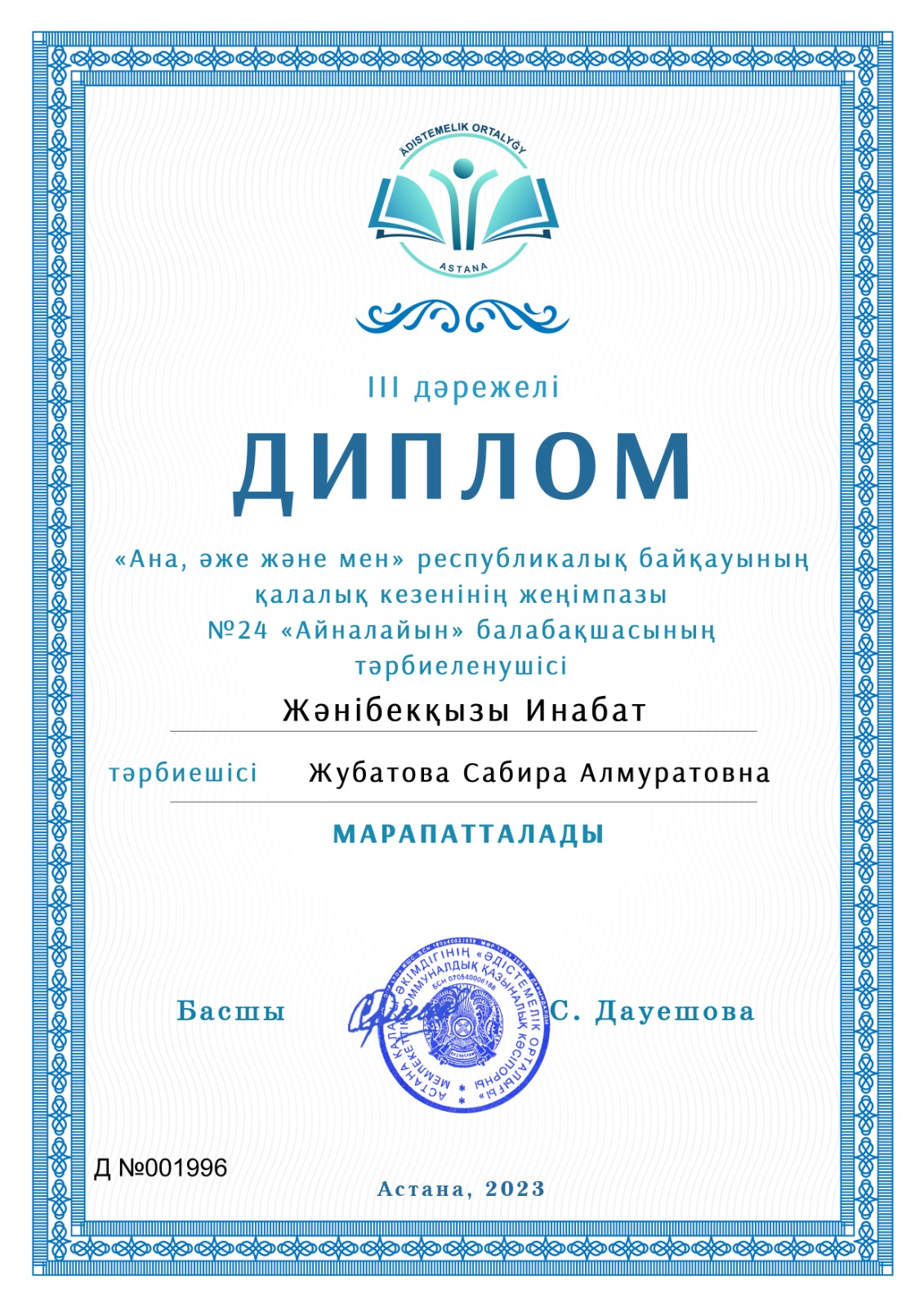 Заведующая: Даулетбаева Раушан Жанбатыровна, образование — высшее; стаж работы 19 лет.