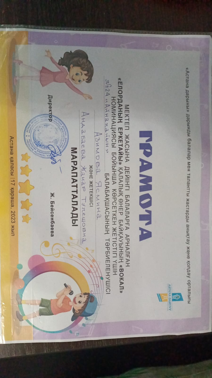 17.11. 2023 Азимова Ясина "ЕЛОРДАНЫҢ ЕРКЕТАЙЫ" қалалық өнер байқауынаң "ВОКАЛ" номинация бойынша жеттістігін көрсетті. Жетекшісі: Андабаева Жанар Тулешовна