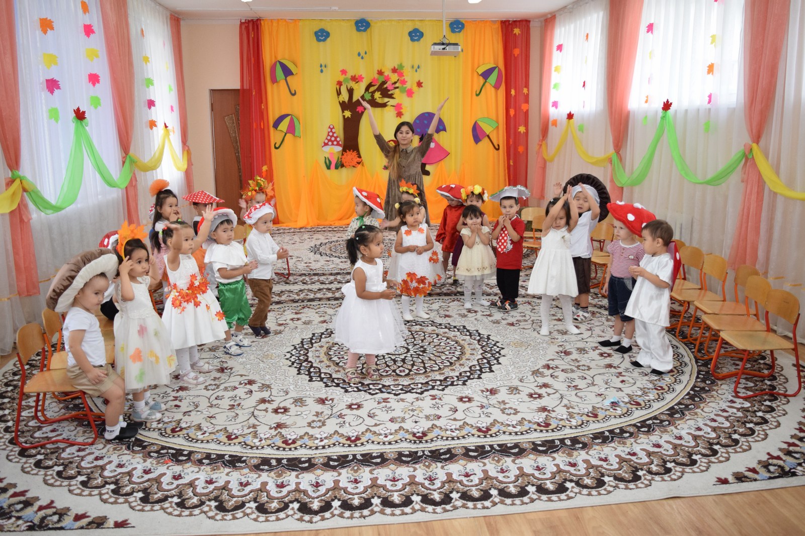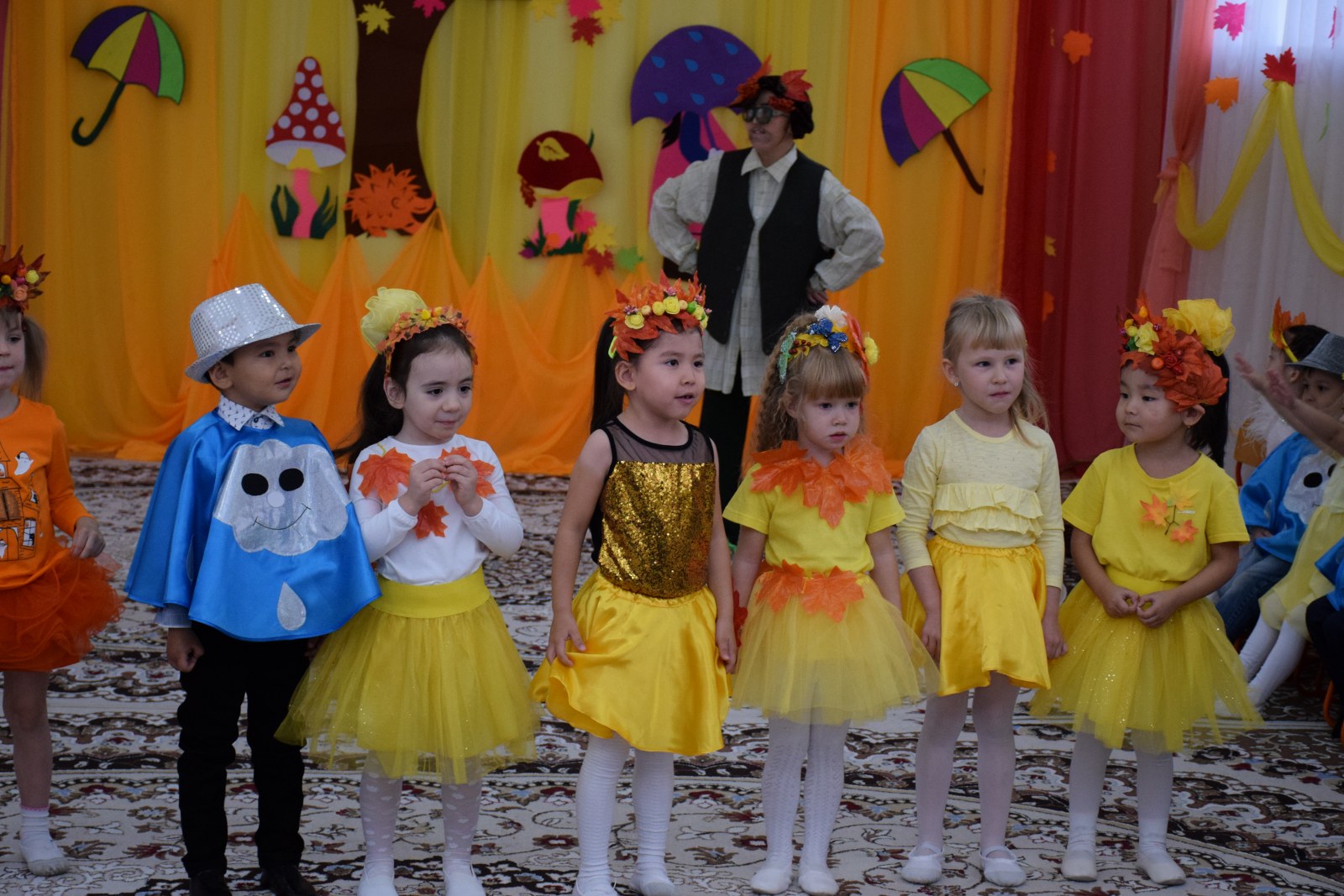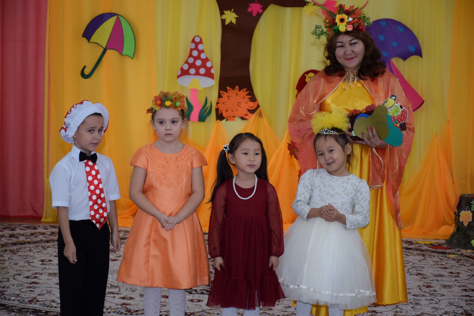 Балалар күз туралы ән шырқап, тақпақ айтып, би билеп, көңілді ойындар ойнады. Балалар тиін, аю, кірпі, саңырауқұлақ кейіпкерлерін жақсы сомдап шықты. Ата-аналар, тәрбиешілер балалардың драмалық талантын бағалай алды.
