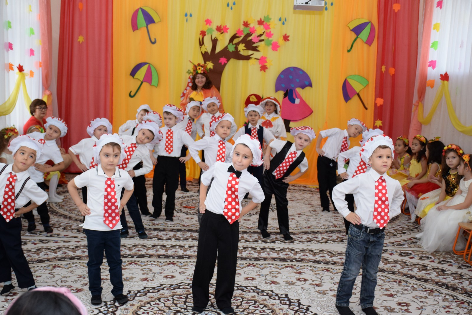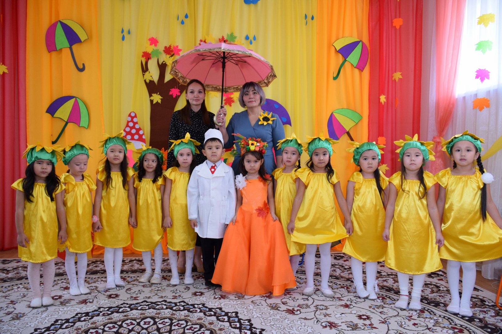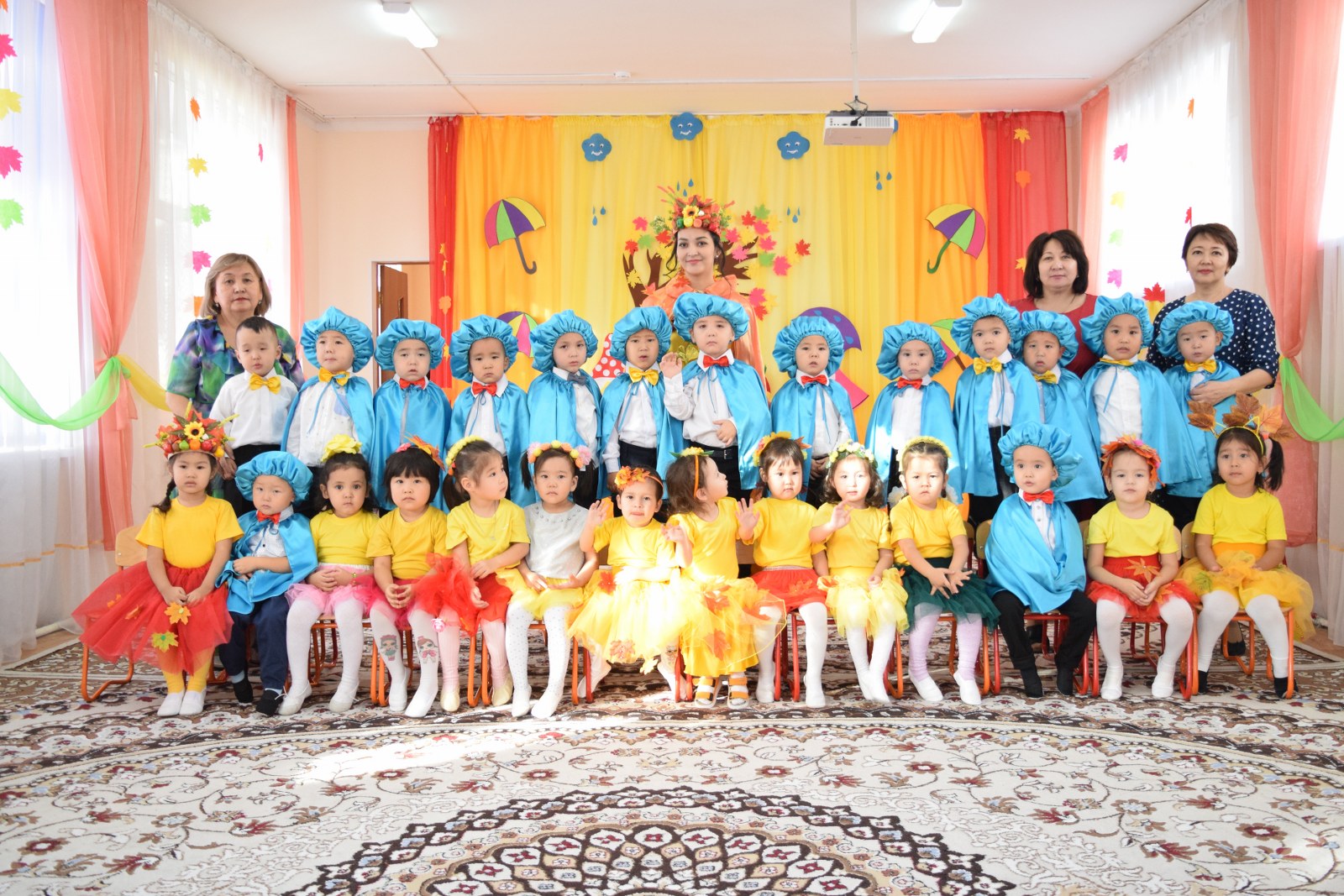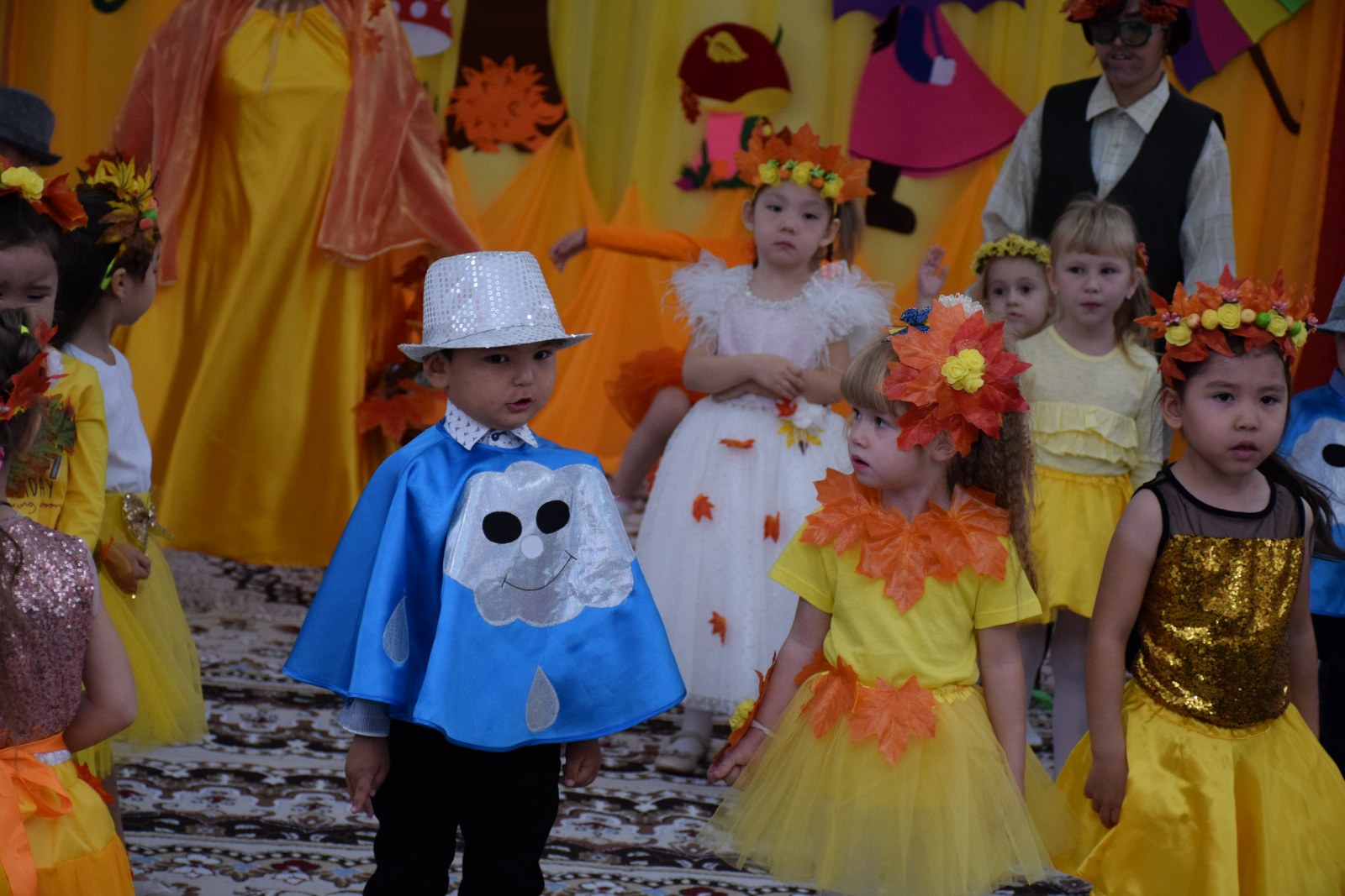 Балалар күз туралы ән шырқап, тақпақ айтып, би билеп, көңілді ойындар ойнады. Балалар тиін, аю, кірпі, саңырауқұлақ кейіпкерлерін жақсы сомдап шықты. Ата-аналар, тәрбиешілер балалардың драмалық талантын бағалай алды.